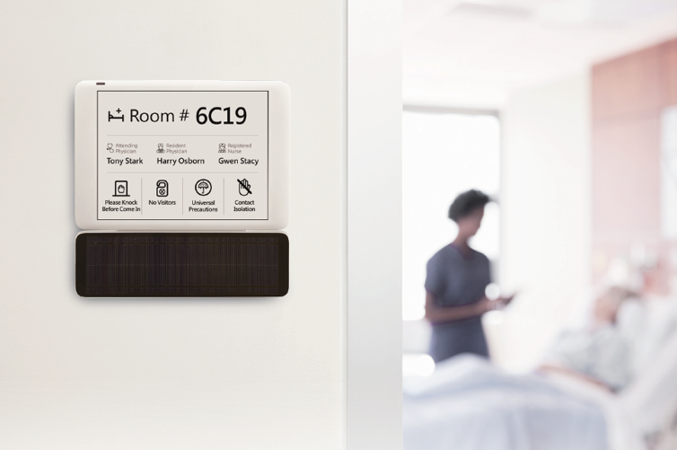 智慧床頭卡與房門卡正是避免傳統溝通錯誤的最新技術解決方案,主要是設置在病房外的病房資訊顯示看板,提供病患的照護與預防措施等重要資訊給照護人員,而安裝於病房內的病患資訊顯示看板,則可讓病患、家屬與醫護人員即時掌握病患照護的最新訊息,兩項產品透過中央管理系統(Central Management System)的無線傳輸更新資訊,有助於整個醫院與醫療體系的資訊流通性。