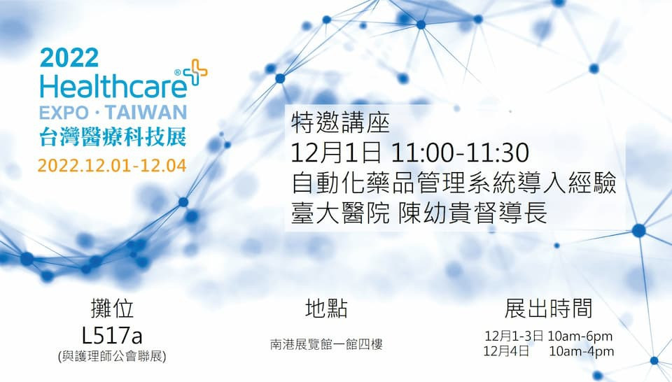 本次特別邀請台大醫院陳幼貴督導長於12月1日11點蒞臨會場分享「自動化藥品管理系統導入經驗」,完整的講座相關資訊請參考全聯會網站。誠摯邀請您蒞臨參觀。